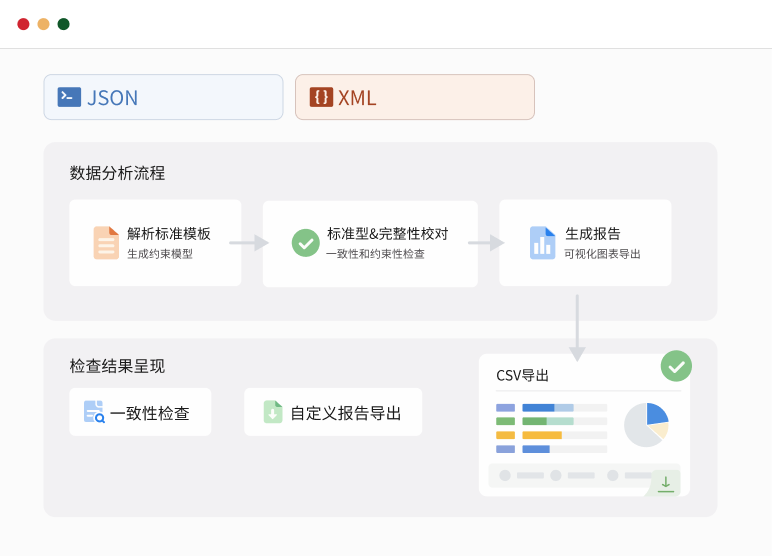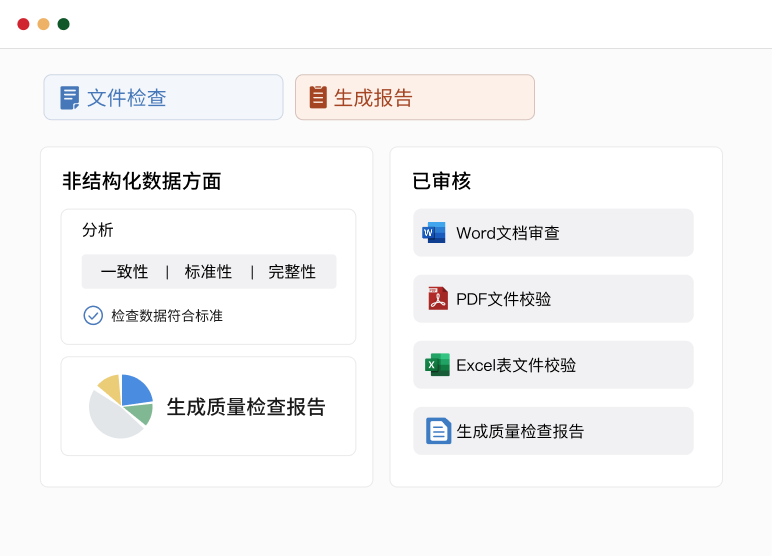 支持结构化、半结构化和非结构化数据的标准符合性检查,提供检查结果的在线查看和自定义报告导出功能。