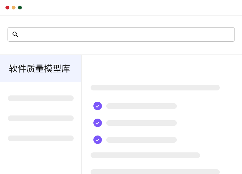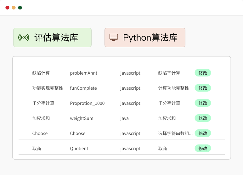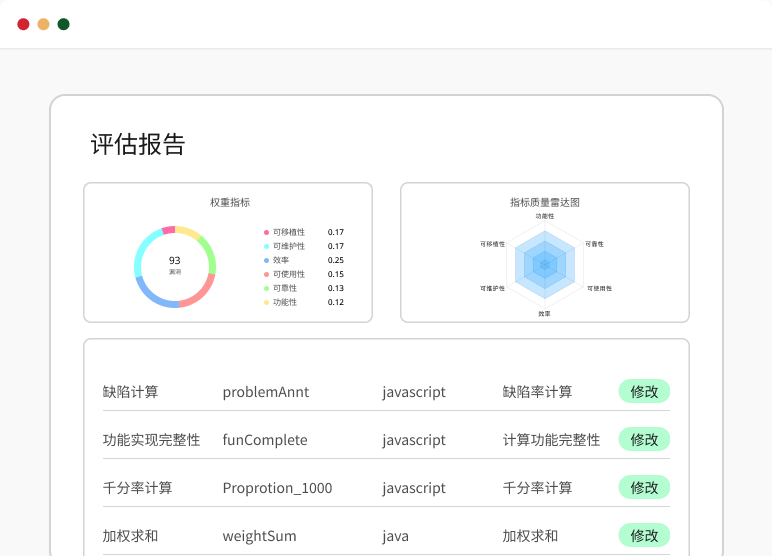 依据GB/T25000、GJB5236等标准通过度量指标和算法建立软件质量评估模型,从使用、产品质量等维度进行软件质量综合评估。
