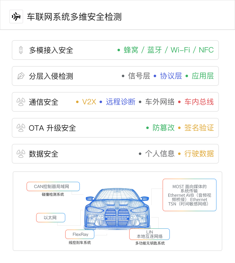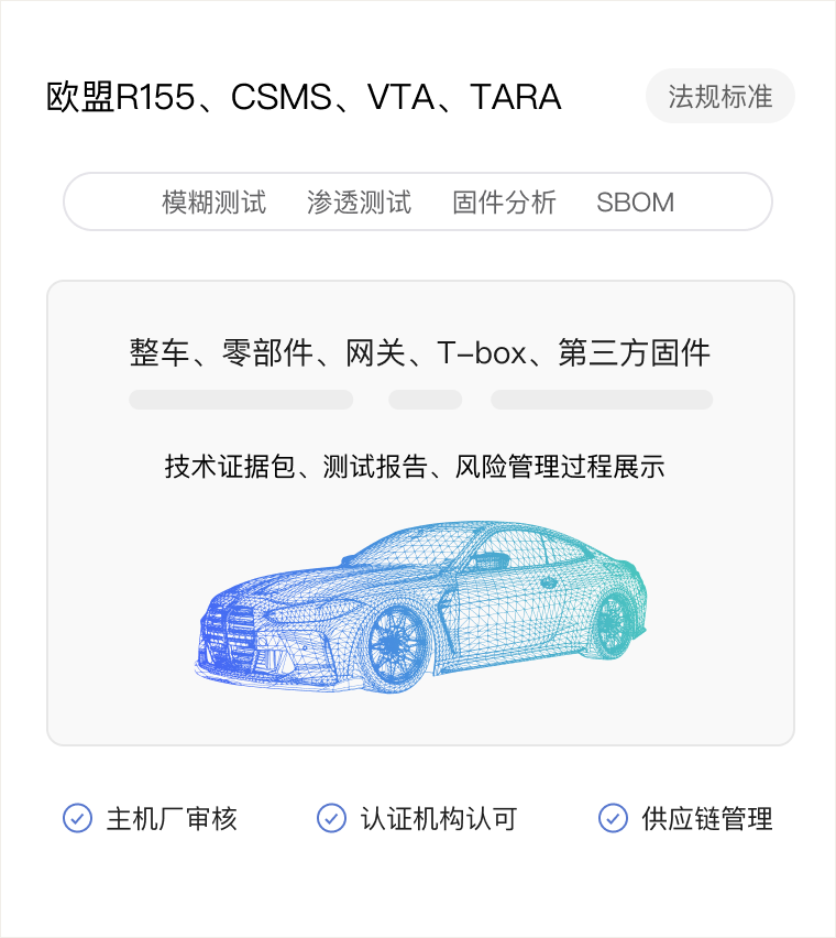 围绕 GB 44495-2024《汽车整车信息安全技术要求》与 UNECE R155 法规框架,将固件漏洞扫描平台、Wisdom 模糊测试工具等旗舰产品整合为“交钥匙”级实验室工具链。客户无需外购检测服务,即可在自有实验环境中完成从威胁分析(TARA)到固件、协议、整车、云端的全栈安全验证,实现“法规合规+风险前置”双重目标。