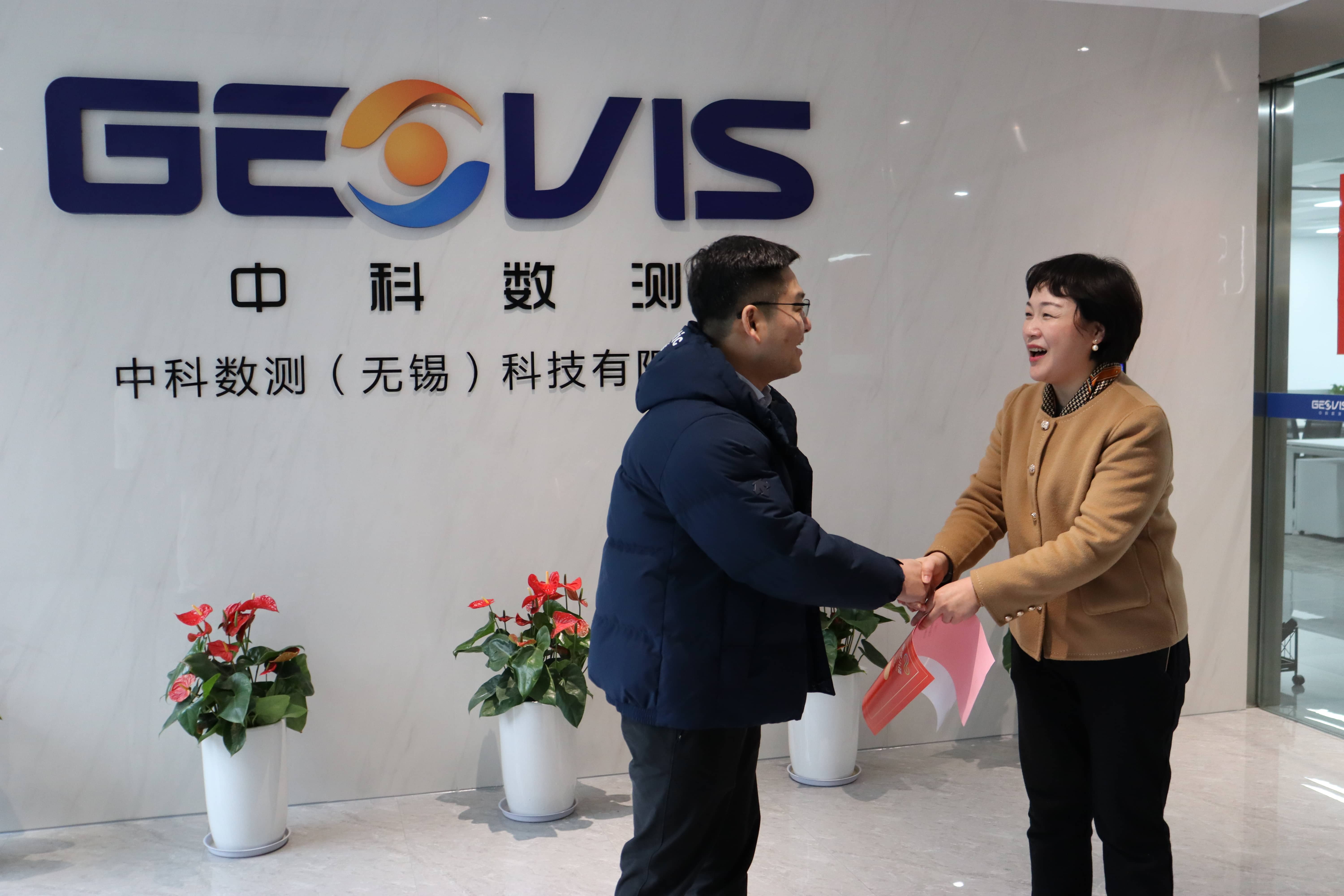 雪浪小镇园区主任狄荟琛先是代表无锡经开区党工委、管委会向中科数测致以诚挚的节日问候,并送上感谢信和新春对联!